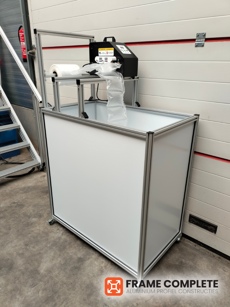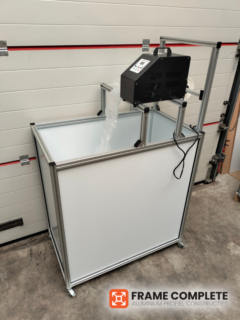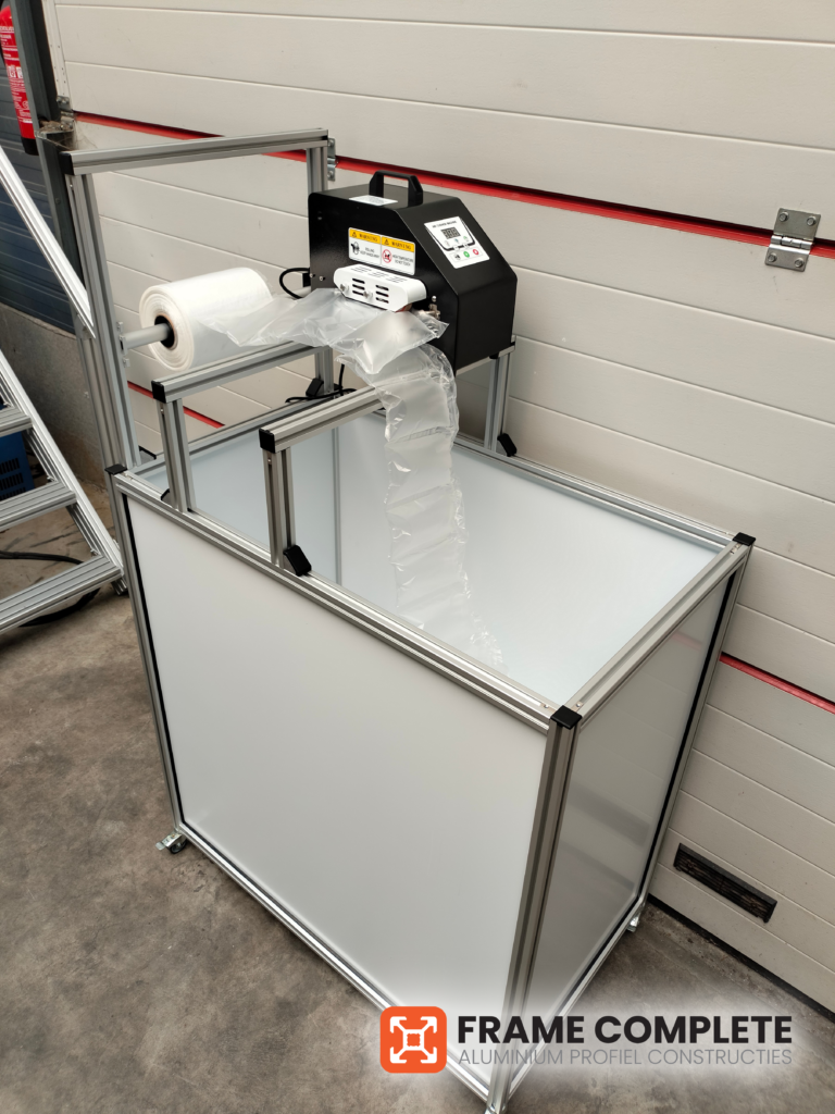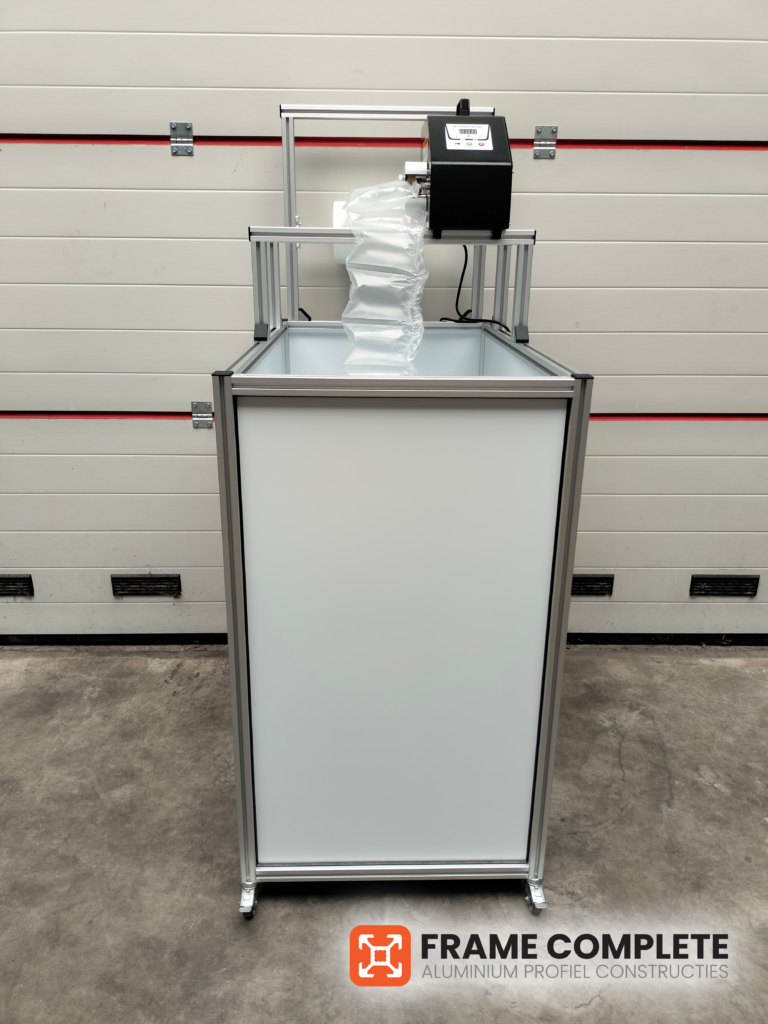 Opvangbak voor het opbergen van luchtkussenzakjes die bij het verpakken gebruikt worden om dozen op te vullen. Deze opvangbak is mobiel middels de zwenkwielen en eenvoudig te verplaatsen door het lichte gewicht. De extra frames die op de bak zijn gebouwd dragen de machine en één frame is voorzien van een D28 buis als rolhouder.