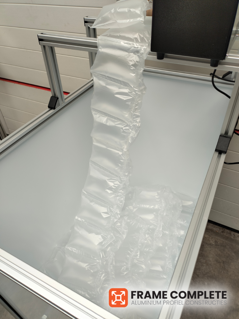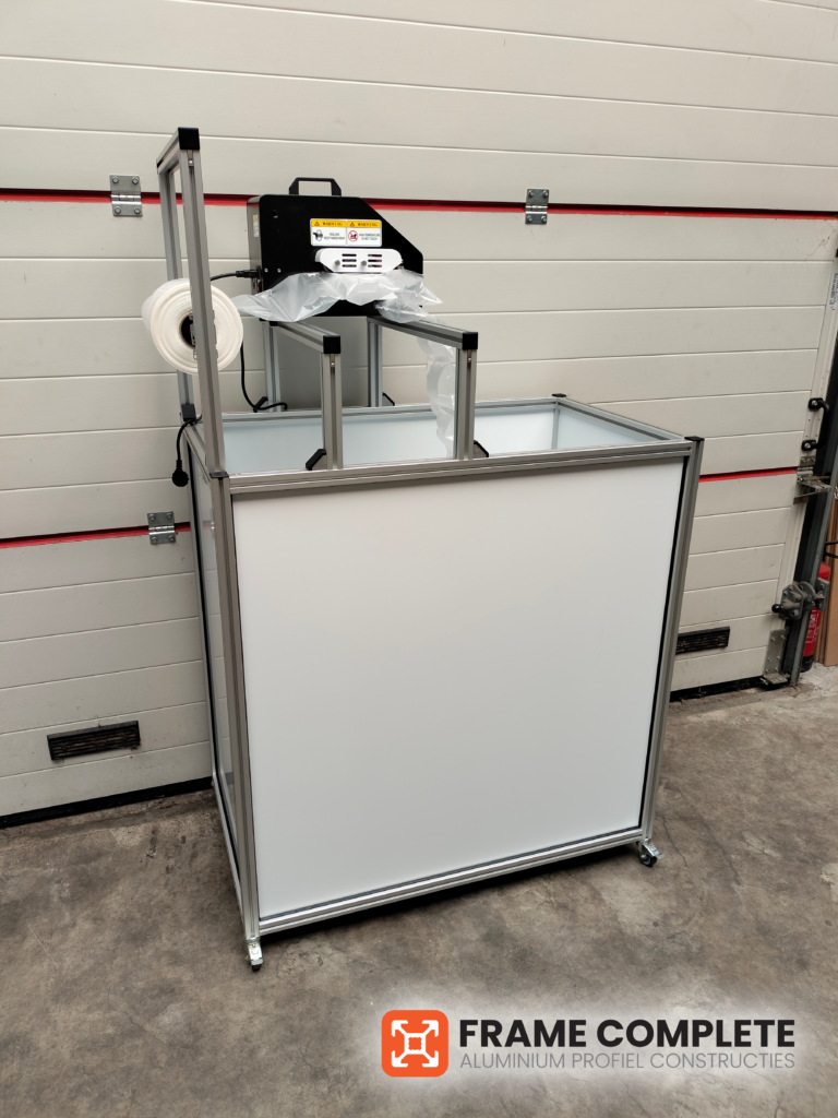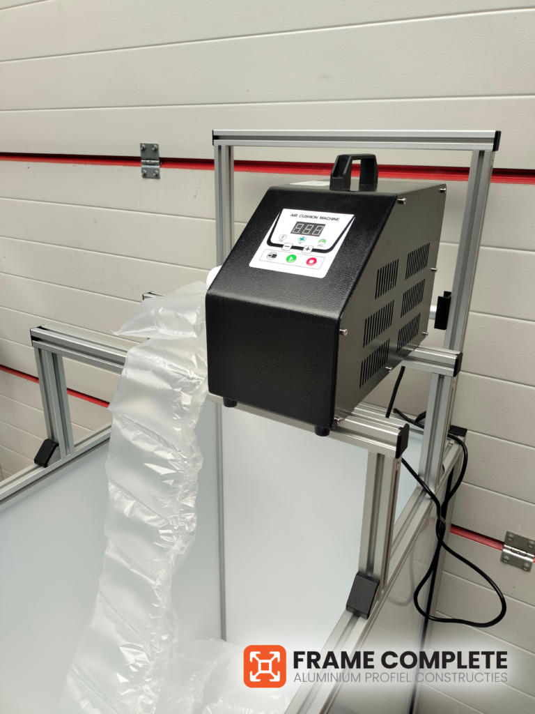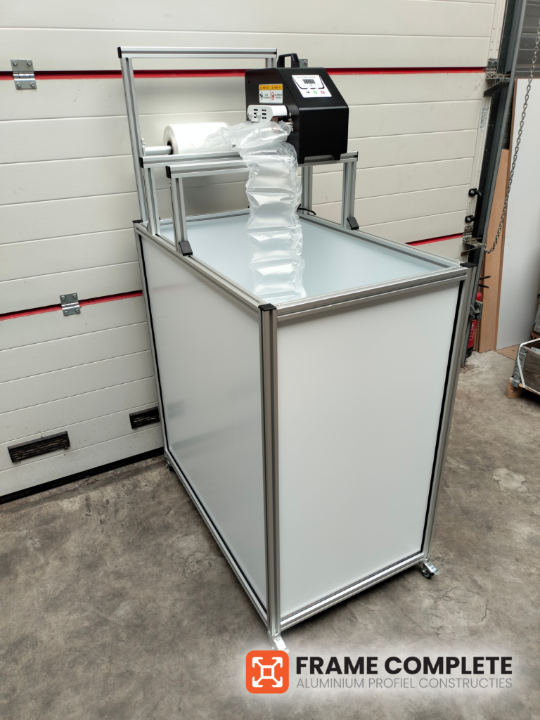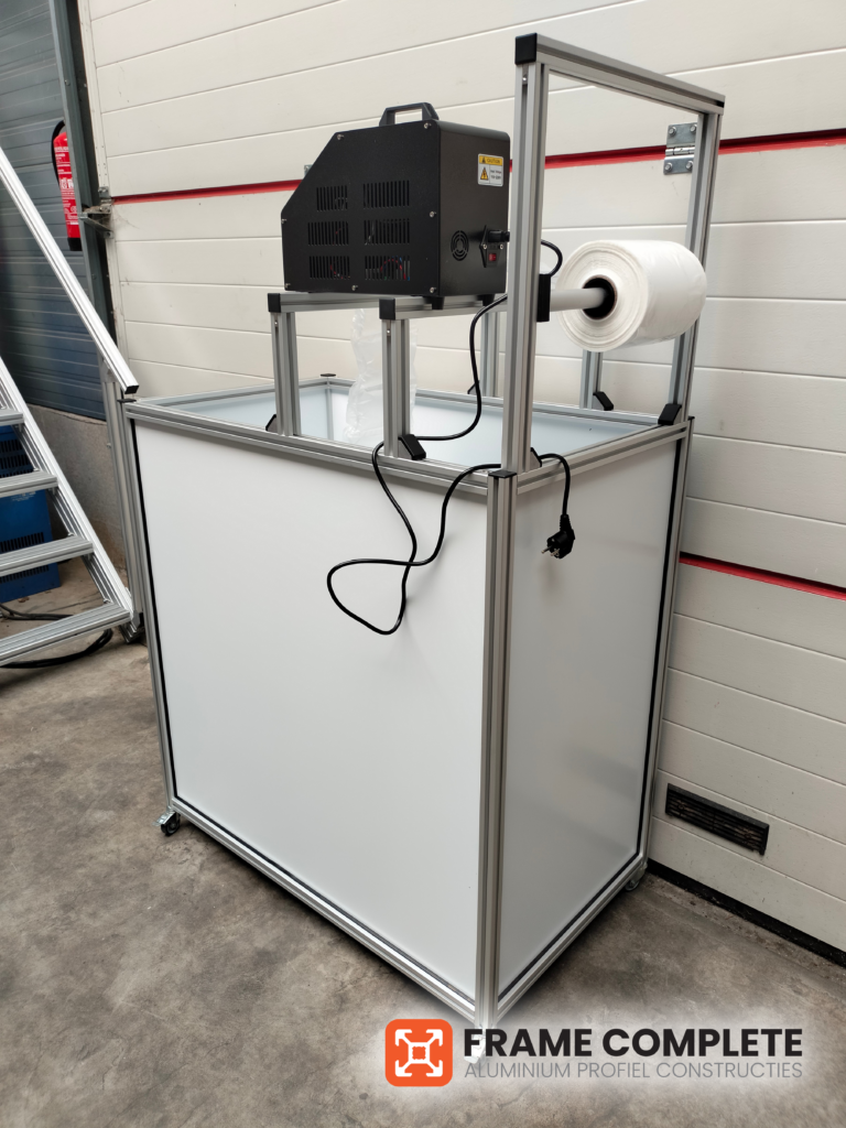 Opvangbak voor het opbergen van luchtkussenzakjes die bij het verpakken gebruikt worden om dozen op te vullen. Deze opvangbak is mobiel middels de zwenkwielen en eenvoudig te verplaatsen door het lichte gewicht. De extra frames die op de bak zijn gebouwd dragen de machine en één frame is voorzien van een D28 buis als rolhouder.